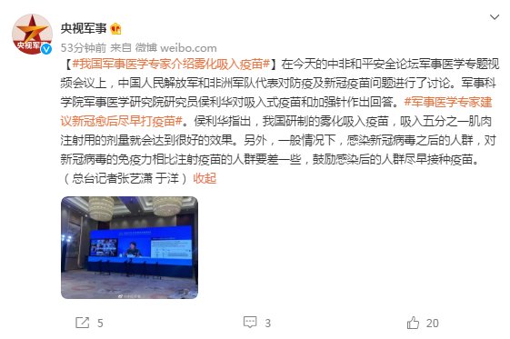 【#我国军事医学专家介绍雾化吸入疫苗#】在今天的中非和平安全论坛军事医学专题视频会议上,中国人民解放军和非洲军队代表对防疫及新冠疫苗问题进行了讨论。军事科学院军事医学研究院研究员侯利华对吸入式疫苗和加强针作出回答。#军事医学专家建议新冠愈后尽早打疫苗#。侯利华指出,我国研制的雾化吸入疫苗,吸入五分之一肌肉注射用的剂量就会达到很好的效果。另外,一般情况下,感染新冠病毒之后的人群,对新冠病毒的免疫力相比注射疫苗的人群要差一些,鼓励感染后的人群尽早接种疫苗。(总台记者张艺潇 于洋)